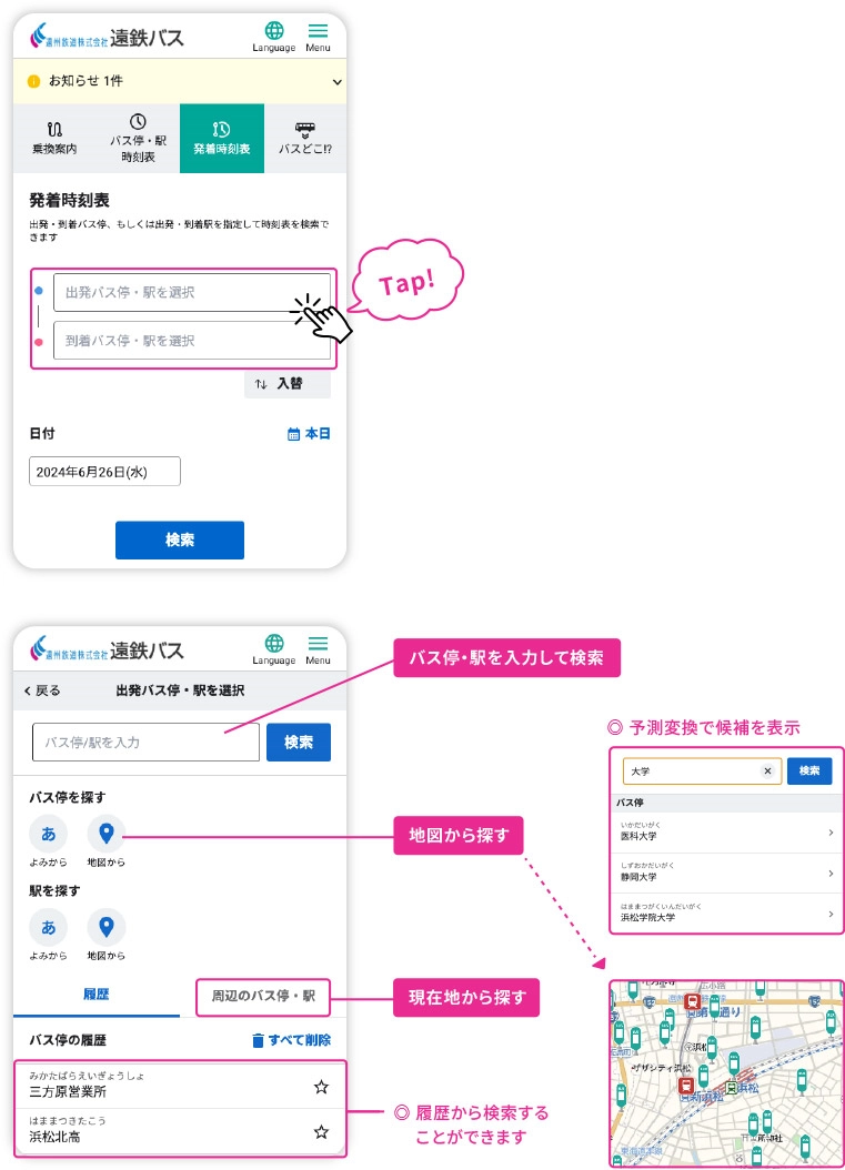 地図や現在地からバス停を選択することができます。