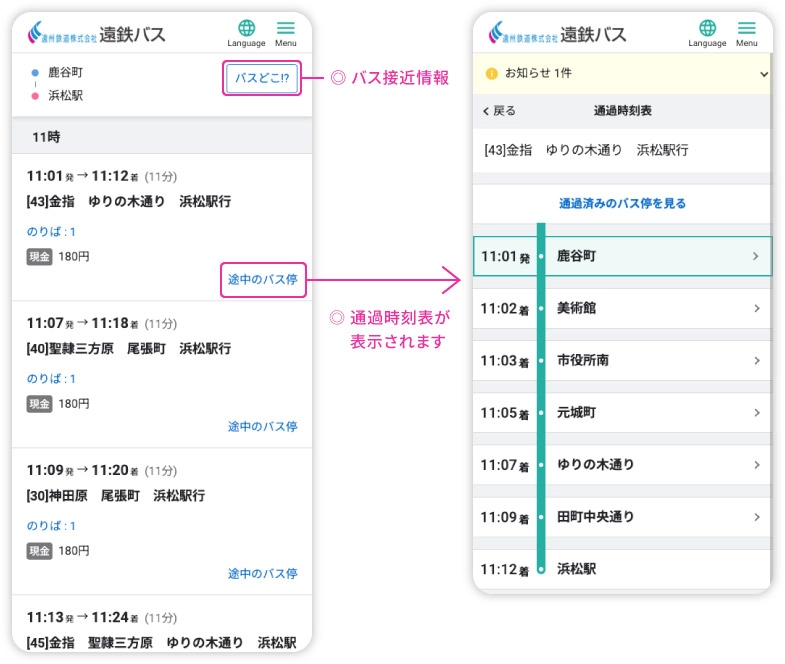 ① 出発バス停と到着バス停を入力