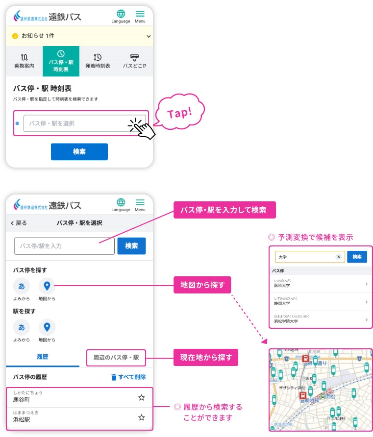 地図や現在地からバス停を選択することができます。