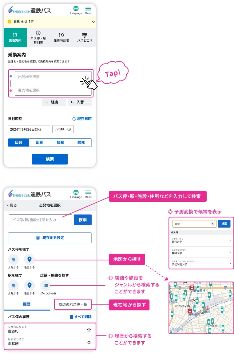 バス停名や駅名がわからなくても、 地名や学校・病院・その他の公共施設等のランドマーク名称で入力ができます。また、地図からの選択もできます。