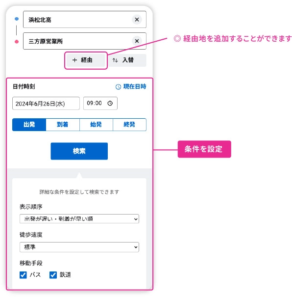 出発日時や目的地の到着日時など具体的な条件を設定することができます。また、ご希望する交通手段や乗換方法も設定できます。