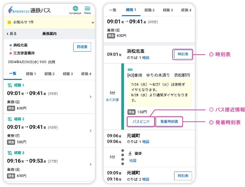 移動に必要な情報が表示されます●移動時間 ●所要時間 ●運賃 ●ルート ●乗換回数 ●時刻 ●バス接近情報