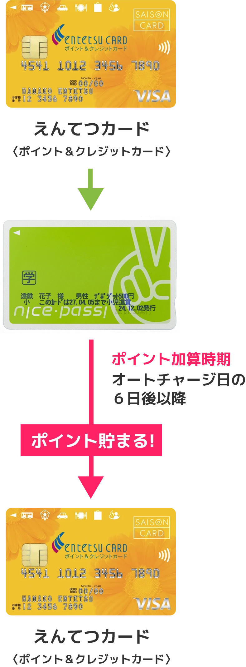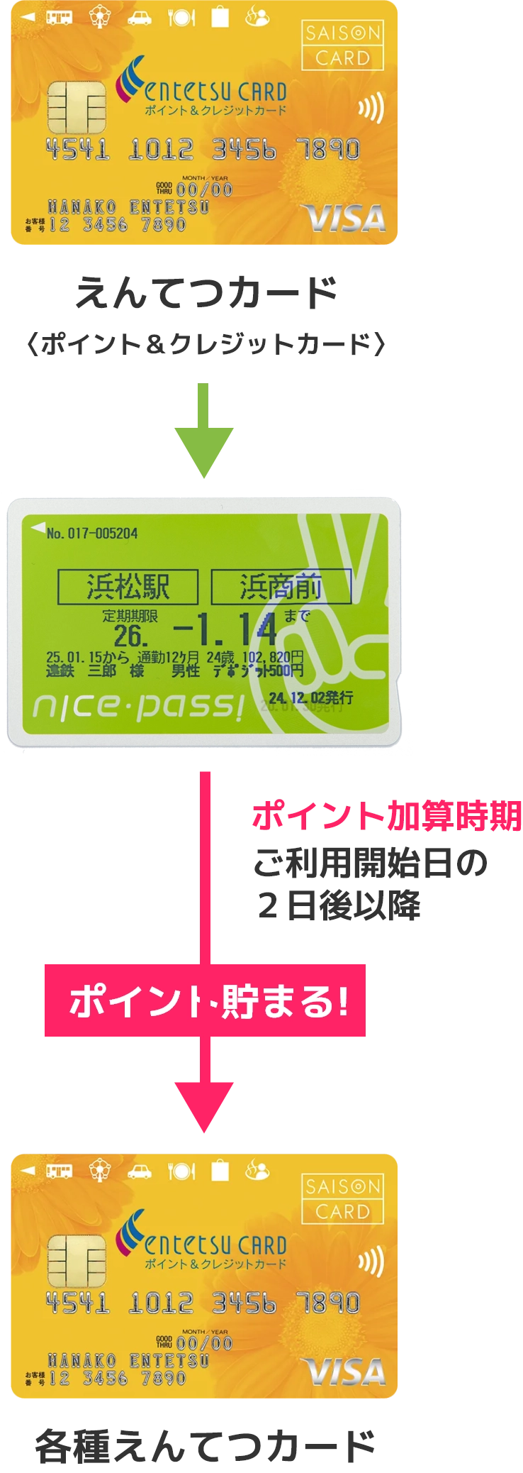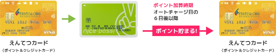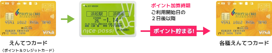 定期券に登録された、ナイスパスと同一名義の「えんてつカード」にポイントが加算されます。